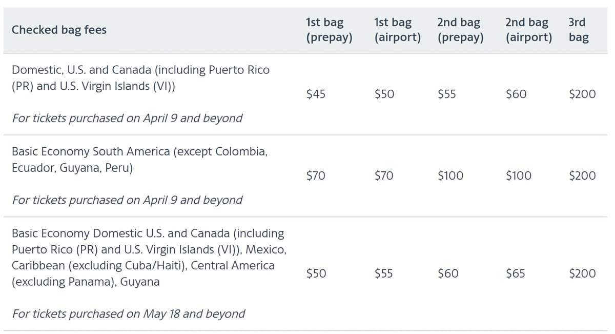 Here’s American’s press release: “For tickets booked on or after April 9, the new bag fee for domestic flights, including Alaska, Hawaii, Puerto Rico, and the U.S. Virgin Islands, as well as Canada and short-haul international flights, is $50 for the first checked bag, $60 for the second, and $200 for the third when purchased at the airport. Customers who prepay for their first and second checked bags on aa.com or through American’s mobile app will receive a $5 discount, paying $45 and $55, respectively.”