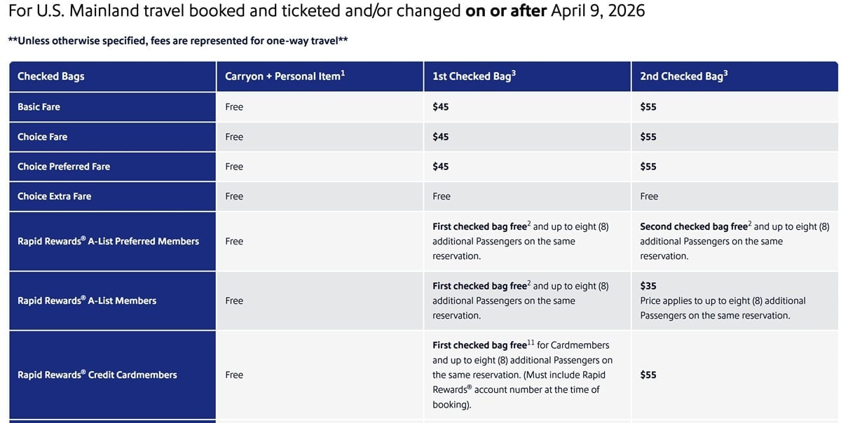 Southwest Airlines is raising baggage fees by $10, with the first checked bag now $45 and the second $55. Carry-on bags and personal items remain free for Basic fares.