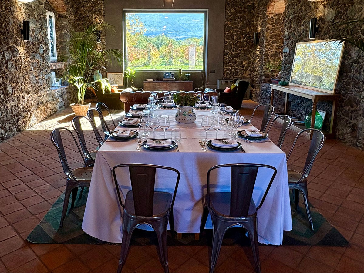 To sample those vintages, we visited the nearby Cottanera Winery for a memorable post-Etna lunch. In a gorgeous lava-stone dining room, we feasted on cheese from sheep that graze on the grounds, pasta made from local grain, and a succession of wine-paired antipasti. It was a pinch-me moment as I gazed out the picture window at what resembled an Impressionist painting: the neatly planted vineyard marching toward Etna’s perpetual plume.