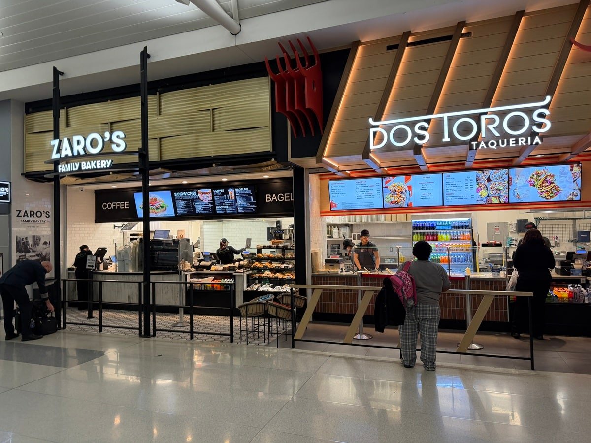 Terminal 8 now has improved dining options, including local favorites like Eataly, Zaro’s Bagels (I grabbed one for my daughter for $2.90), and Dos Toros Tacos.