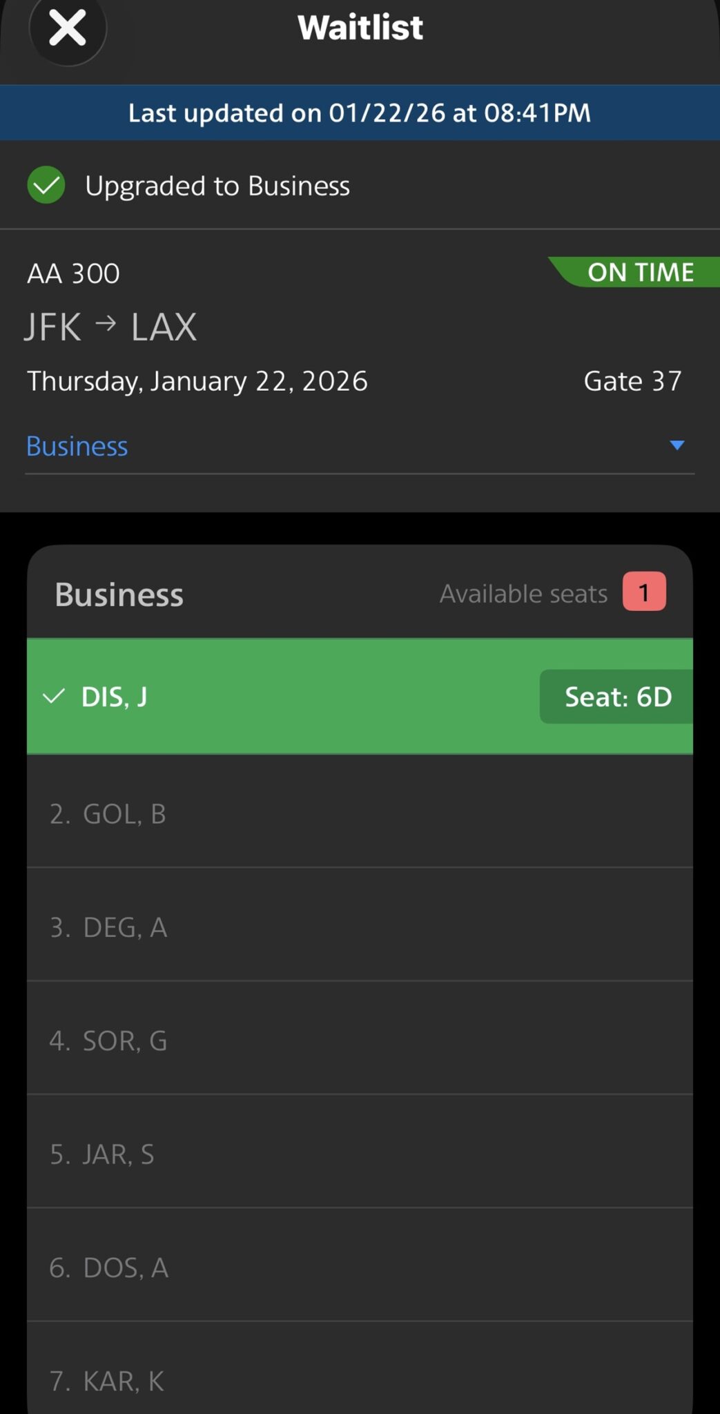 I then checked with the gate agent at 37, and he said there was still hope if I waited 10 minutes. When my name was paged, I couldn’t believe it—the upgrade gods came through!