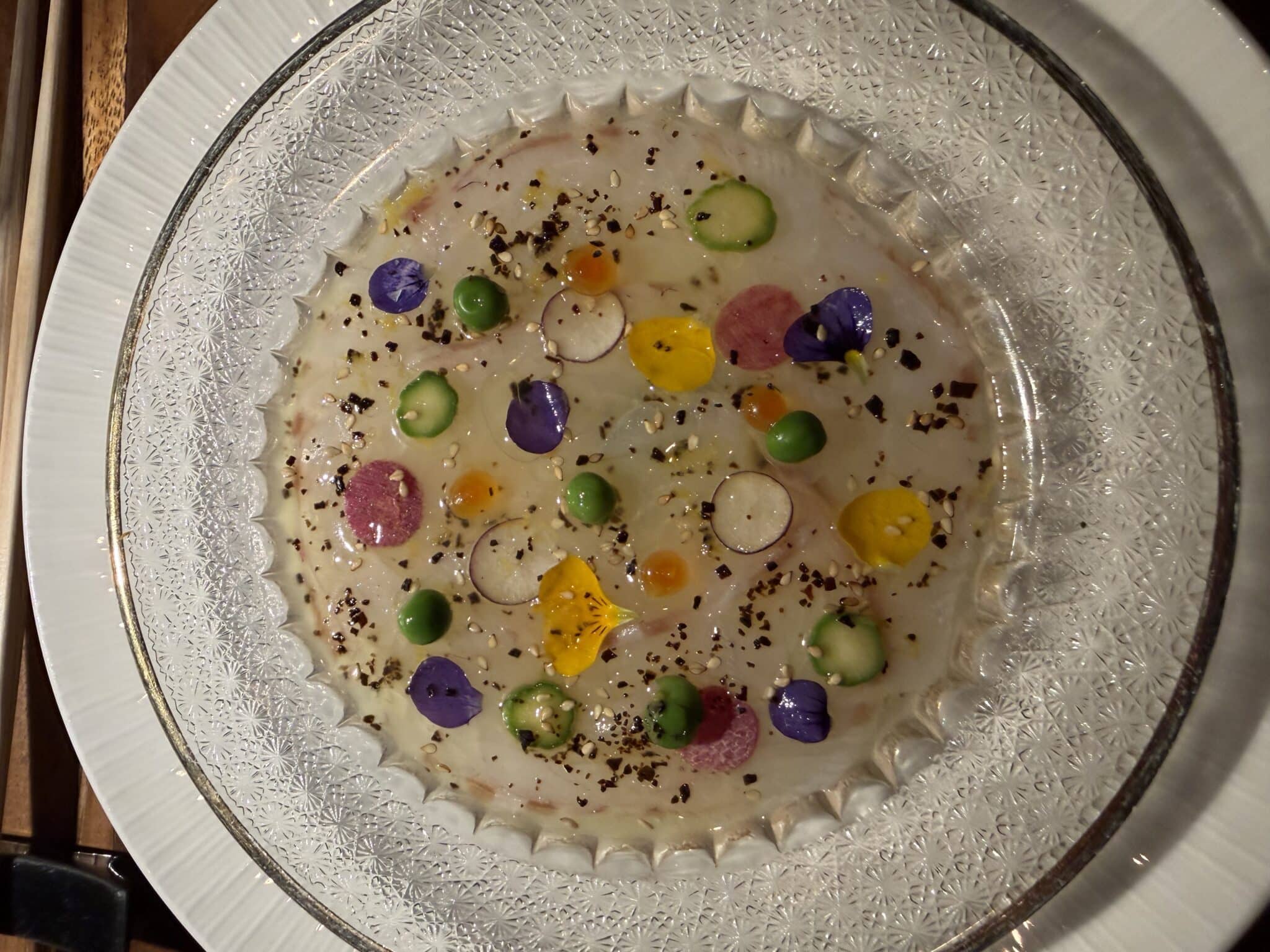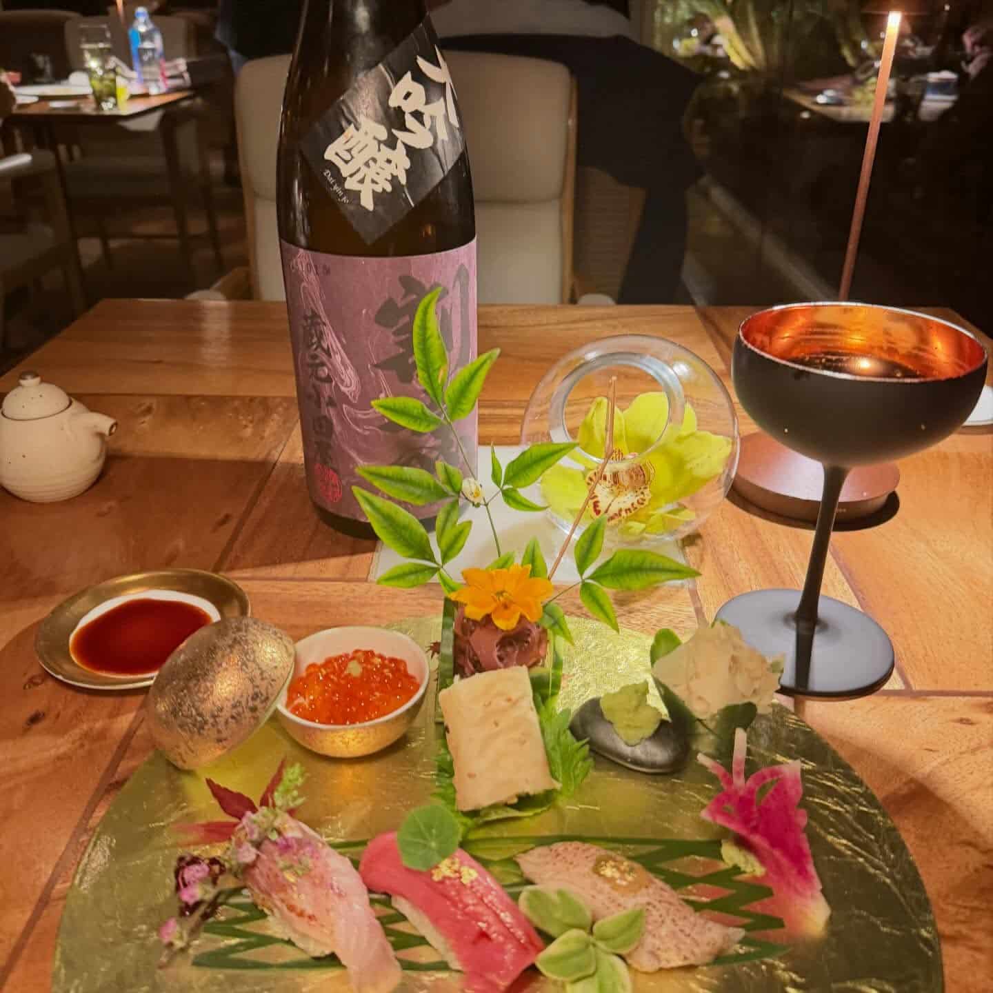 First, uni cold noodles with sweet shrimp arrived with gold flecks and caviar, then another stunner was presented – Japanese Madai Snapper Sashimi thinly spread across the plate with dallops of color from flowers, watermelon radish, shio kombu, peas, and salmon roe. The Lobster tempura appetizer might be what I’d request for my last bite in life – while the fresh sushi plate with blue crab handroll and ikura, plus a Crispy Rice topped with Spicy Tuna Sushi course were close seconds.