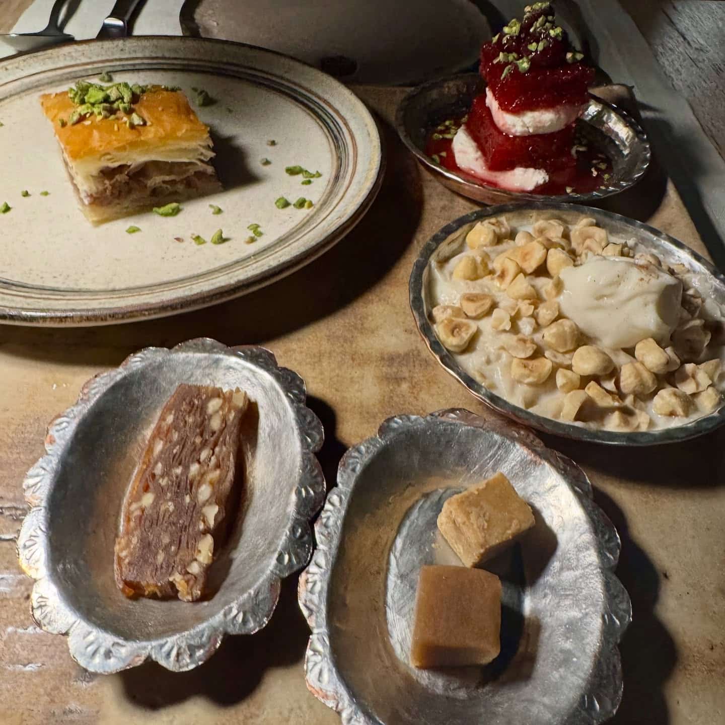 Traditional Turkish comfort food, Yaglama, was delicious. The thinly-layered, handmade lasagna includes a savory minced meat and vegetable sauce. Desserts tantalized, with a smorgasbord of bites, like molasses sorbet with grapes, Turkish custard pudding topped with nuts, Turkish halva, dried molasses with nuts, and baklava drizzled with grape molasses.