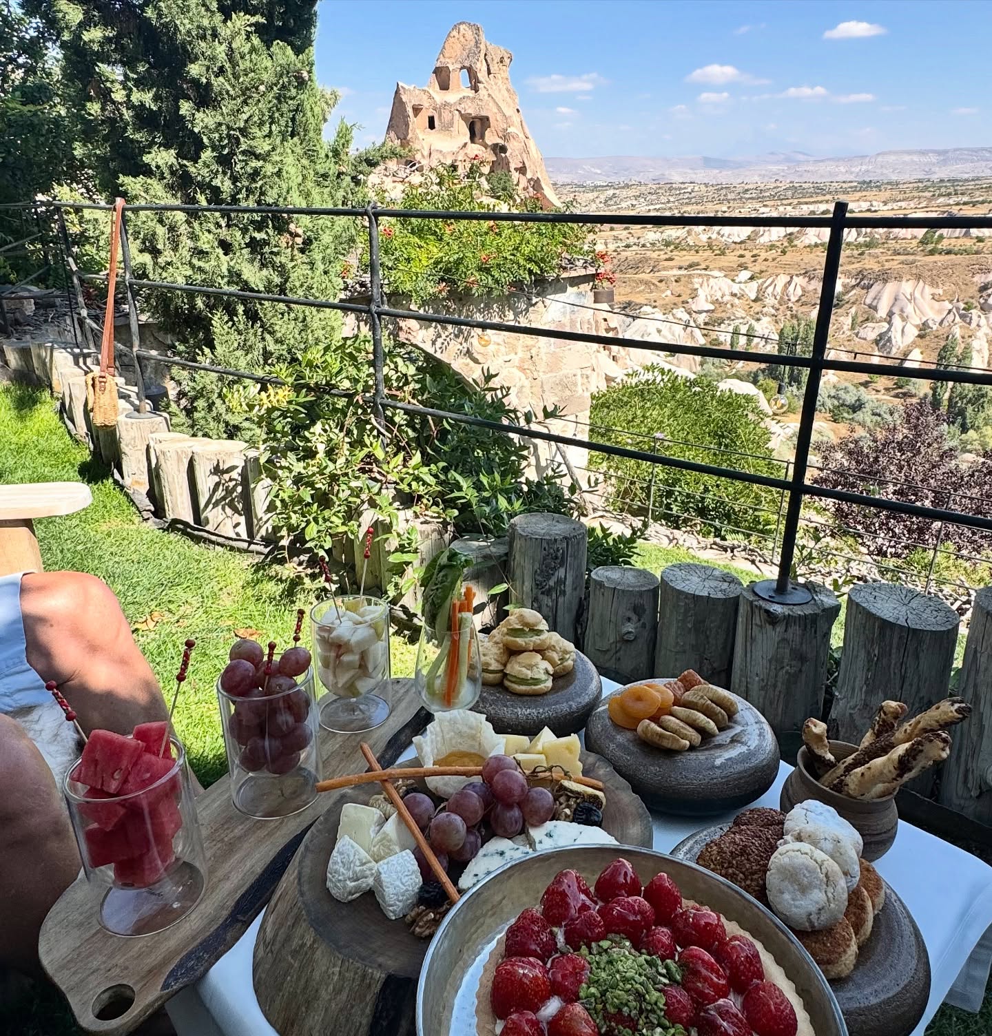 Argos also offers an over-the-top private picnic experience on their infinity terrace, overlooking the valley. A sign greeted us by name, to an enchanting garden area, including a chef-prepared multi-course setup with generous portions of charcuterie, local fruit, strawberry crème tart cake, and wines. Live music was set up just for us, to enhance the ambiance, and continued with a slew of artfully arranged dishes on wooden slabs, such as pizza, corn on the cob, sandwiches and salads.