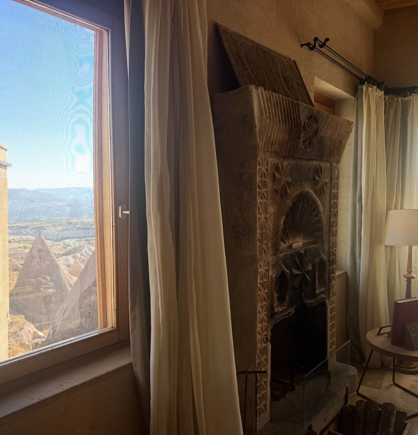 Our suite, with living room and ancient carved-wood burning stone fireplace (that could be lit upon request) was thoughtfully decorated with local pottery, wool rugs and a salvaged painted door used as art, adding to the overall feel of being in a distant land. Windows offered delicious views of the mystical landscape, even from the bathroom. Amenities included turndown service with treats, a Dyson hair dryer, and a thoughtful, sustainable, in-room recycling program, refillable glass water bottles, and QR codes to conserve paper.