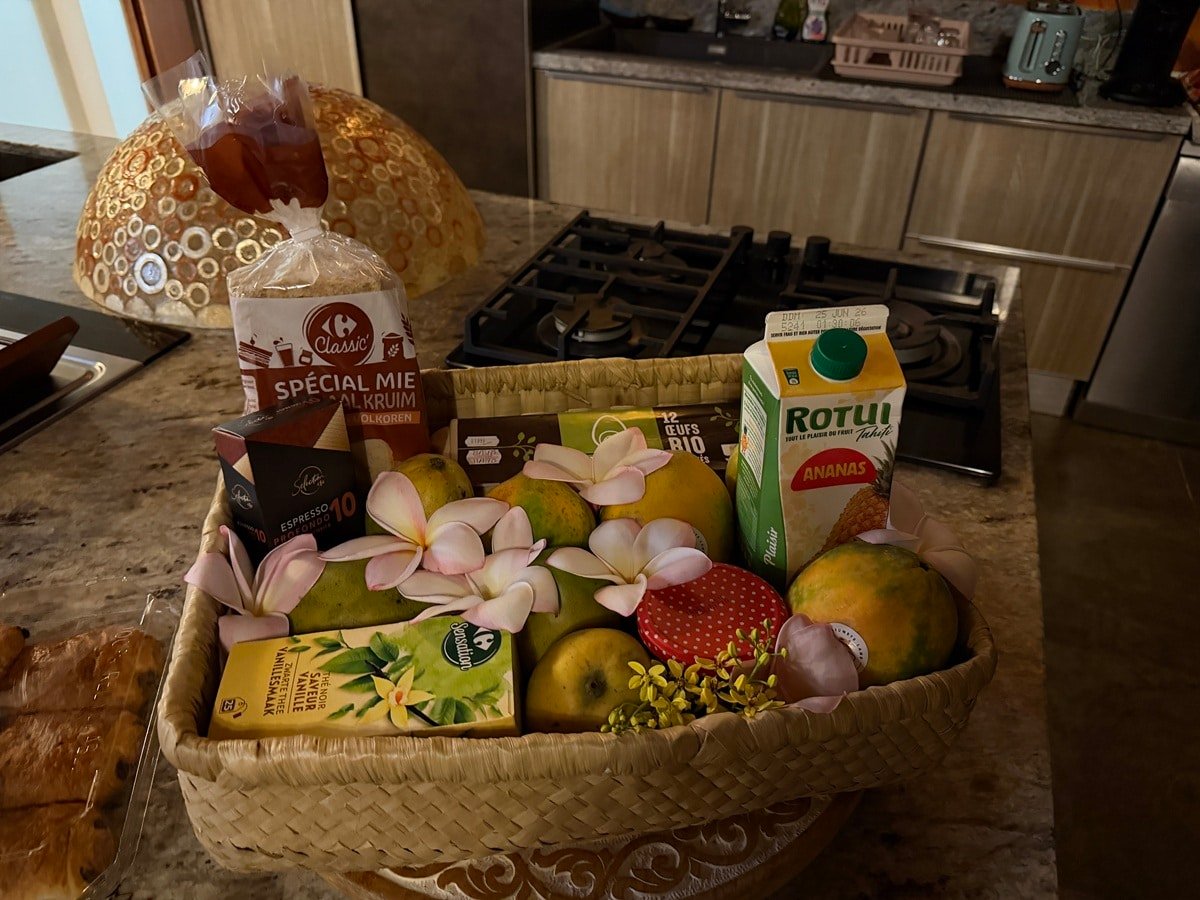 What’s also great about renting from Tahiti Homes is that they offer a selection of four breakfast baskets to start the stay, so you don’t need to worry about going to the grocery store on the first day. Our basket came with bread, eggs, mangos, papaya, butter, jam … Here’s more information.