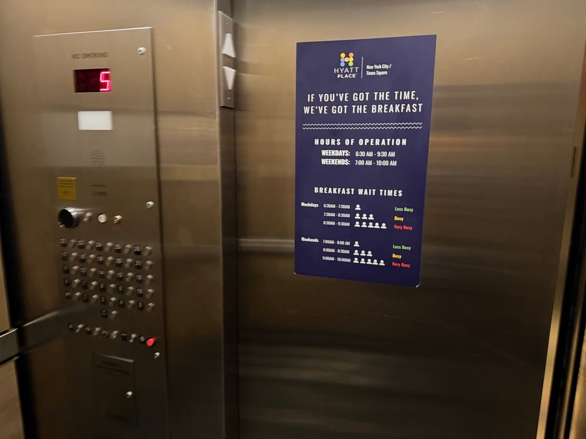 Inside the elevator, there’s a sign listing the best breakfast times: 6:30–7:30 a.m. on weekdays and 7–8 a.m. on weekends.