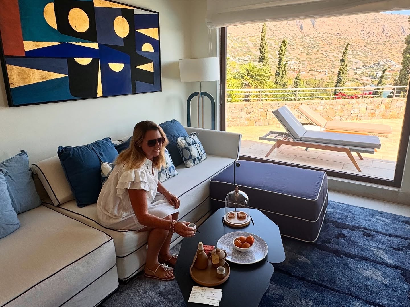 Just walking around the lush garden feels ceremonial, as the subtle scents of wild herbs and flowers intermingle with the salt air. The view alone at this Greek Shangri-La may have you wondering how you can be in this mystical birthplace of Zeus and live like Dionysus, Aphrodite, Apollo or Artemis. The enormous suite adds to the tranquility – donned in white with blue accents and curated Greek art, plenty of closet space, a communal living room, two bathrooms, and grand marble bath with walk-in shower for two. But the massive outdoor pool terrace is the real star and creates the feeling of a private retreat.