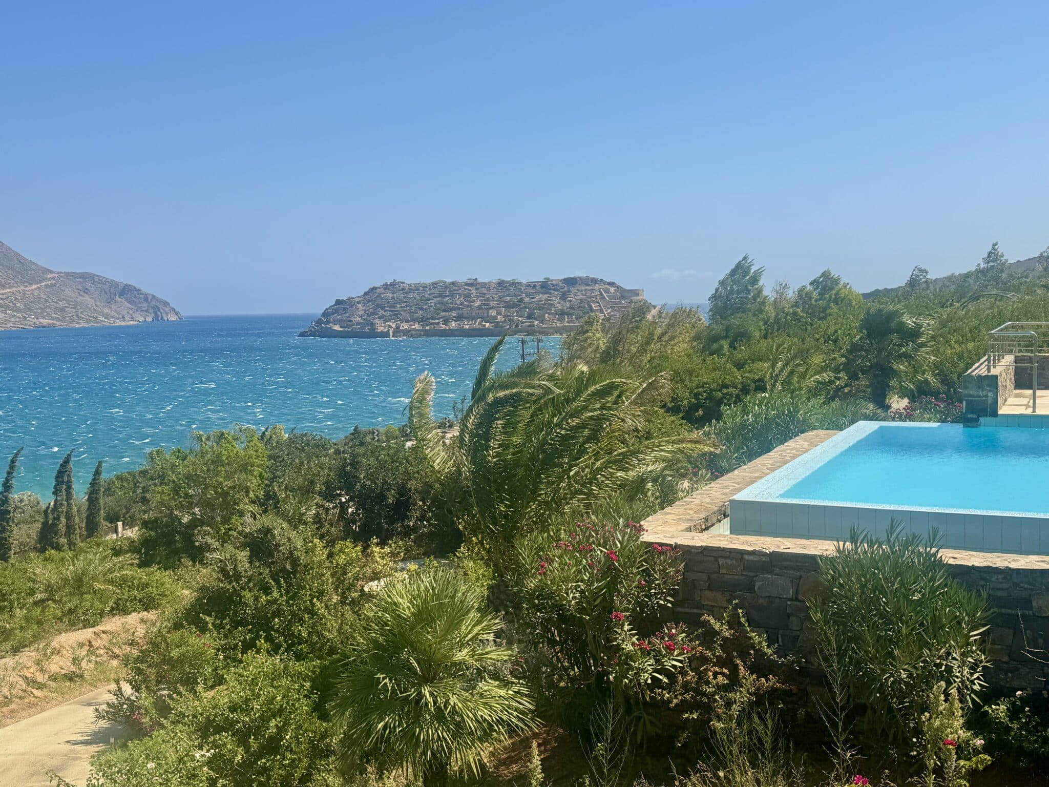 In the morning, warm winds welcome the day, with a dazzling unspoiled view of the Aegean, hugged by mountains with Spinalonga Island in the distance, a former leper colony until 1957. The rugged hillside terrain and surrounding foliage are reminiscent of coastal Southern California. Below the property, a rocky private beach beckons guests to soak up the sparkling azure ocean on a lounge chair with umbrellas, or dip into the warm waters off a private dock.