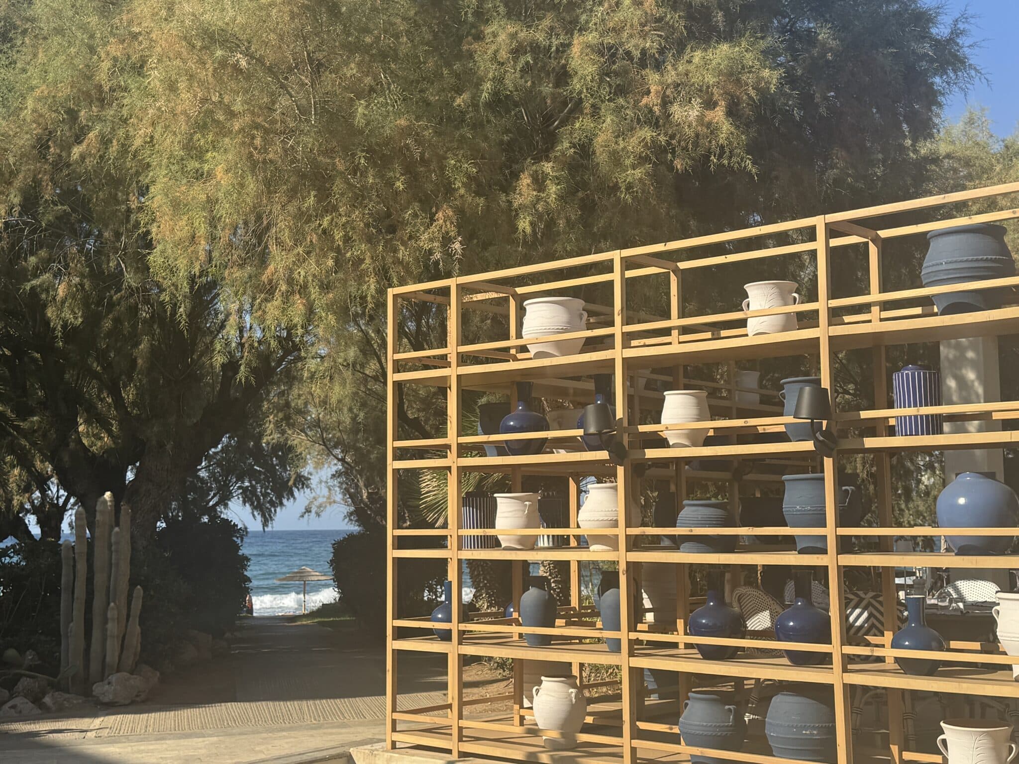 The design vibe of the hotel is reminiscent of something you might see in SoCal or Miami, and every style choice is executed to excite the eye – creating attractive spaces to mingle on mod bespoke furniture – with fun colors, an overflow of books, potted foliage and even ceramics floating on an open shelving near the beach. The seaside suites balance modern elegance with Crete’s earthy tones, terracotta hues, botanical murals, and sea blues, plus floor-to-ceiling windows that let the light in, and details like locally crafted custom furniture that make the stay feel special.